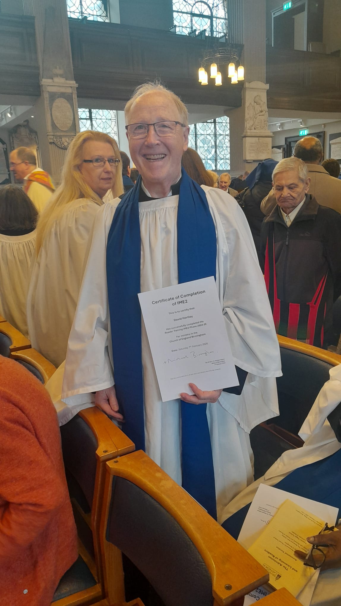 David recently completed his Iinitial Ministerial Training part 2 and today was awarded his certificate at the cathedral. This is a demanding course, and many congratulations to him. This completes the formal part of reader training, but as the Bishop said there is a lifelong element to all our learning! It was great to join with other readers being licensed for the first time or renewing their commitment to this minstry of word and witness.